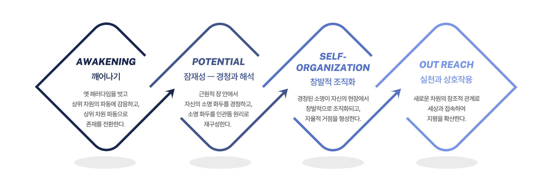 오늘의 지성실업시대는 지금까지 구축해 온 교육방법론의 한계를 나타내지만 아직은 정확한 방향을 잡지 못하고 있습니다. "자기 삶을 화두로 현상학적 해석과정을 넘어 수동적 조명으로!" 그 결과 "조에의 생명으로 깨어나고 살고 가르치기!" 우리의 목표는 이렇듯 분명하고 확실한 '깨어지고 깨어난' 경험 속에서 탄생했습니다. 더 정확히는 사회적 종교적 조건화된 에고의 진을 깨고 생명의 성령의 법으로 다시 태어나는 과정입니다. 어쩌면 이 과정이 다소 겸허한 마음과 기대를 요청할지도 모르겠습니다. 그러나 그 결과는 분명히 생명으로 깨어나는 놀라운 과정이 될 것입니다!